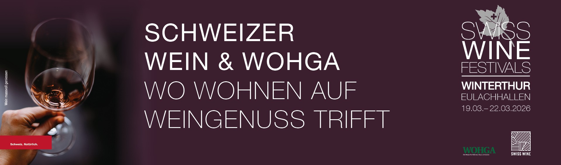 Das SWISS WINE FESTIVAL findet als Sonderschau im Rahmen der WOHGA in den Eulachhallen Winterthur statt. Besuchen Sie das Festival vom 19. bis 22. März 2026 in der Halle 1 der Eulachhallen. Der Eintritt erfolgt über den Eingangsbereich/die Kasse der WOHGA.